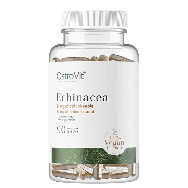 ОстроВит Эхинацея ВЕГЕ — это натуральная пищевая добавка в растительных капсулах, с помощью которой вы можете позаботиться о правильном функционировании вашей иммунной и дыхательной системы. Комбинация двух видов экстракта эхинацеи — экстракта, стандартизированного по 4% полифенолов, и экстракта, стандартизированного по 4% инулоевой кислоты, обеспечивает постоянное количество активных веществ, а значит, эффективность препарата всегда одинакова. Эхинацея, или красная конусовидная эхинацея, — это декоративное растение с красивыми фиолетовыми цветами. Помимо своих уникальных декоративных свойств, она обладает сильными оздоровительными свойствами, благодаря чему ее популярность в нашей стране растет. Использование конусовидной эхинацеи в периоды ослабленного иммунитета может снизить риск инфекций. Действие растения основано на стимуляции фагоцитоза, в ходе которого иммунная система уничтожает бактерии и вирусы. Свойства ингредиентов, содержащихся в OstroVit Echinacea VEGE: ПОДДЕРЖКА ИММУНИТЕТА — Благодаря содержанию активных веществ, таких как флавоноиды, алкамиды, полисахариды и фенольные кислоты, включая инулиновую кислоту, эхинацея эффективно помогает в борьбе с простудой. НАТУРАЛЬНАЯ СИЛА РАСТЕНИЙ — Экстракт эхинацеи OstroVit на 100% состоит из растительных компонентов. Он не содержит дополнительных веществ, которые могли бы препятствовать действию активных ингредиентов. ВЕГАНСКИЙ СОСТАВ — OstroVit Echinacea VEGE — это продукт, который успешно могут использовать вегетарианцы и веганы. Как сама пищевая добавка, так и оболочка капсулы не содержат ингредиентов животного происхождения.